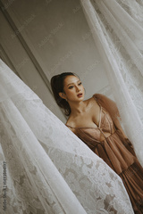 Elegant woman in a brown dress posing behind white lace curtains, looking away