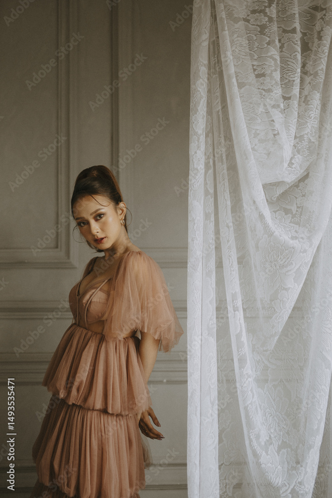 Elegant woman in a tiered pink dress poses near a lace curtain with soft lighting