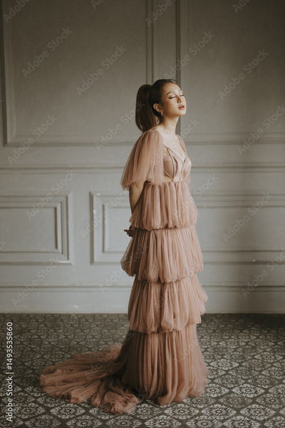 Elegant woman in a tiered pink dress with her eyes closed posing gracefully indoors