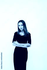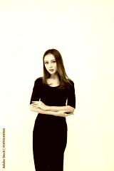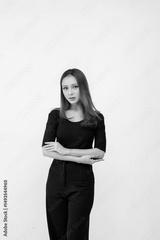 Elegant woman in black outfit stands against a plain white background looking at the camera