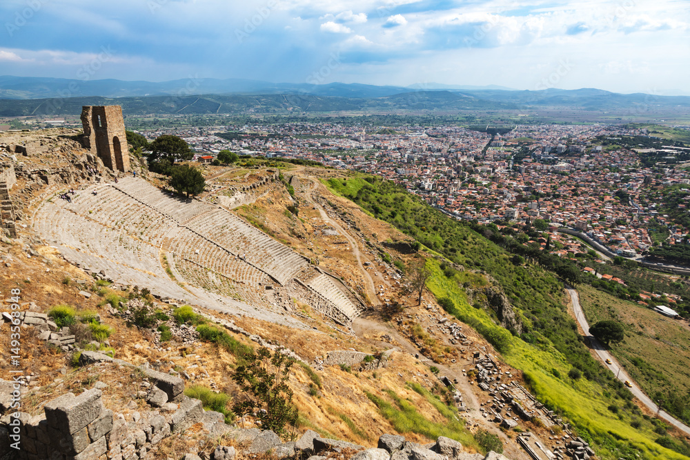 Panoramic view of ancient Hellenistic theatre on Pergamon acropolis overlooking modern city of Bergama Turkey