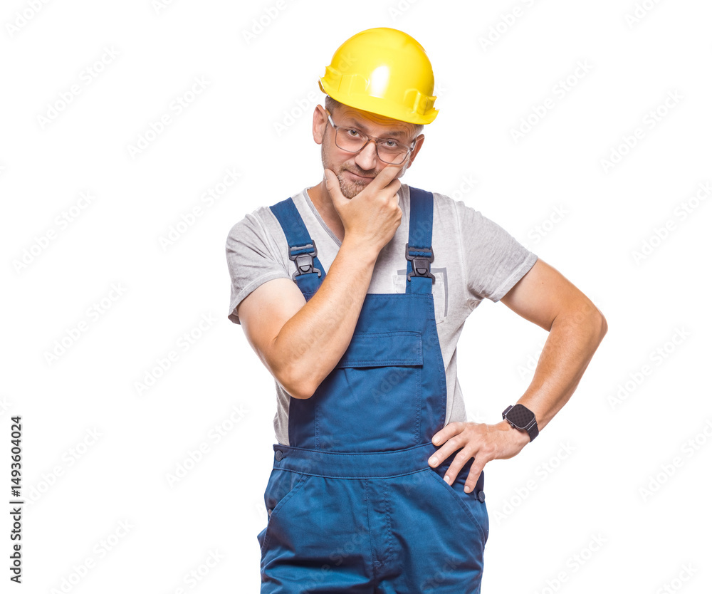 Ashamed construction worker covering face with hand. Shame, isolated on white background. Guilty repairman. Craftsman against white wall