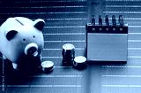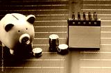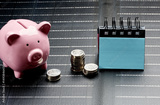 Pink piggy bank next to stacks of coins and desk calendar, symbolizing savings and financial planning