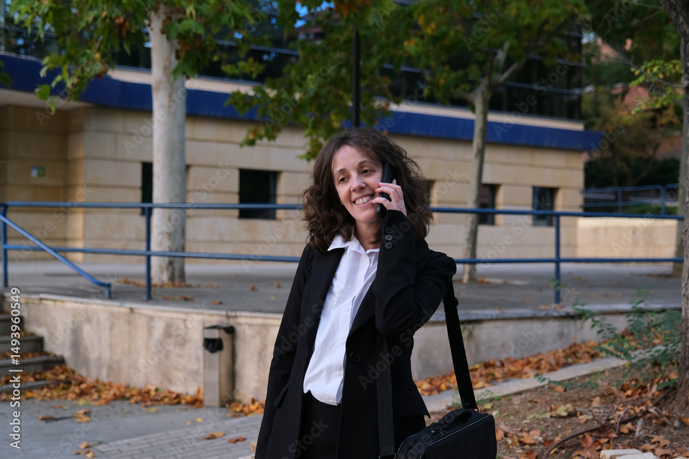 Executive woman smiling talking on smartphone with laptop bag on shoulder