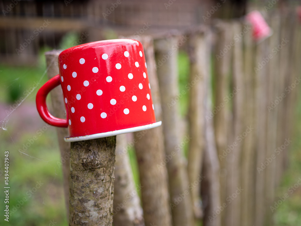 Red polka dot mug on a rustic wooden fence in a garden. A charming countryside detail evoking simplicity and nostalgic rural life.