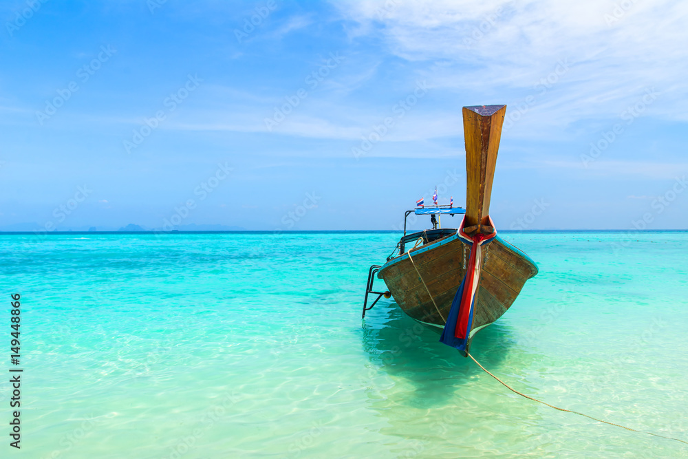 Amazing view of beautiful beach with traditional thailand longtale boat. Location: Bamboo island, Krabi province, Thailand, Andaman Sea. Artistic picture. Beauty world.
