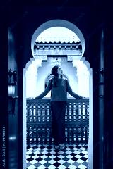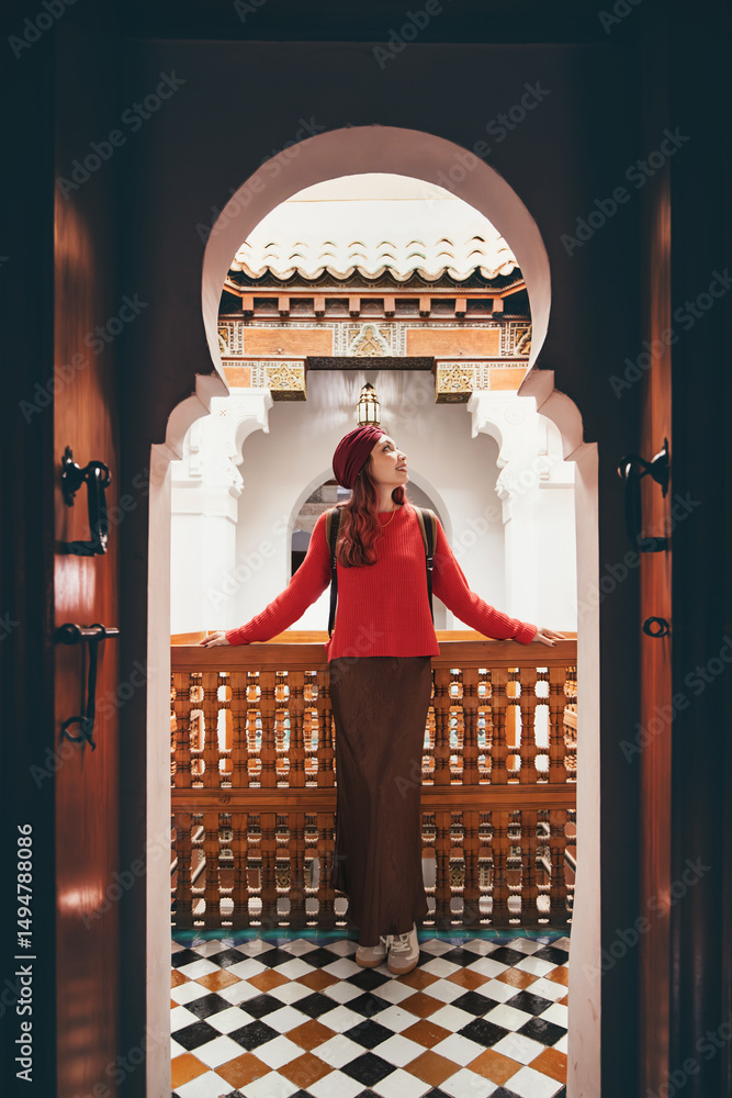Young female tourist admiring intricate details of traditional Moroccan architecture while exploring the vibrant streets of Marrakech, Morocco