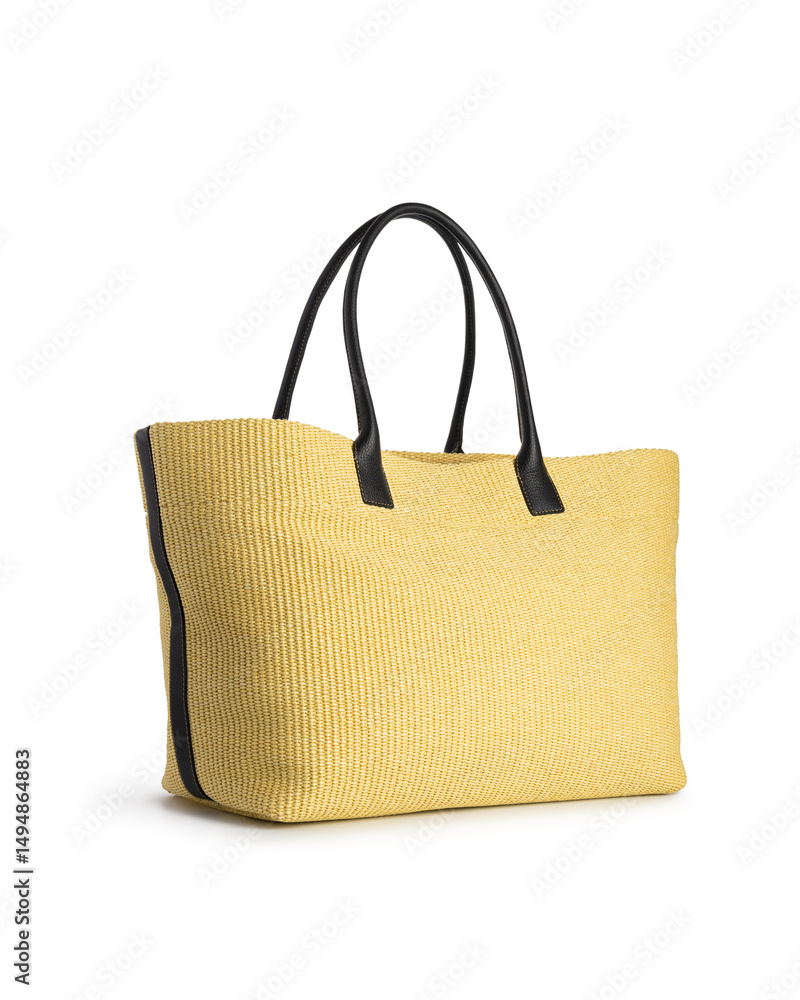 Natural Raffia Yellow Tote Bag, Minimal Eco-Friendly Woven Accessory on White Background