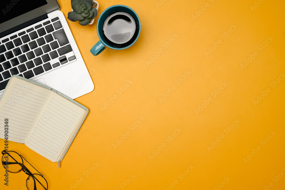 Creative workspace with laptop, notebook, eyeglasses, and coffee mug on yellow background