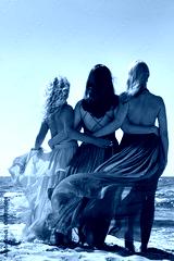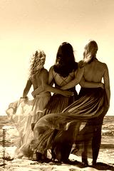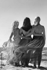 Three Women in colorful flowing Dresses embracing each other looking away on the Beach. Happy Female Friends enjoying Summer Vacation together by the Sea. Woman Power, Freedom and natural beauty