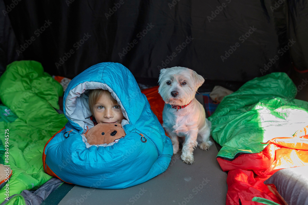 Cute toddler blond child, boy and pet dog,, sleeping in sleeping bag in a tent on a vacation in Norway, wild camping