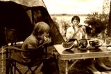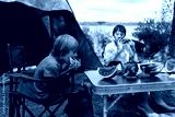 Happy children, eating breakfast and watermelon in the morning in front of a tent in a campsite in the forest in Norway, morning
