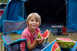 Happy children, eating breakfast and watermelon in the morning in front of a tent in a campsite in the forest in Norway, morning