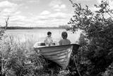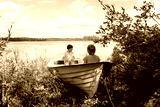 Children, playing on a boat in a river, summertime, watching nature with binoculars, sunny weather