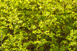 Full frame image of dense lime green shrub with young leaves in late spring or early summer, illuminated by sunlight, for nature and garden design themes.