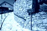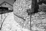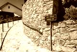 Street paved with natural stone with bilingual sign in Pano Platres village in Troodos mountains, Cyprus
