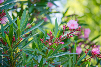 Vibrant pink oleander blooms surrounded by lush green leaves in sunlit garden. Soft focus and natural light create serene, calming atmosphere. Light gently filters through foliage, enhancing colors