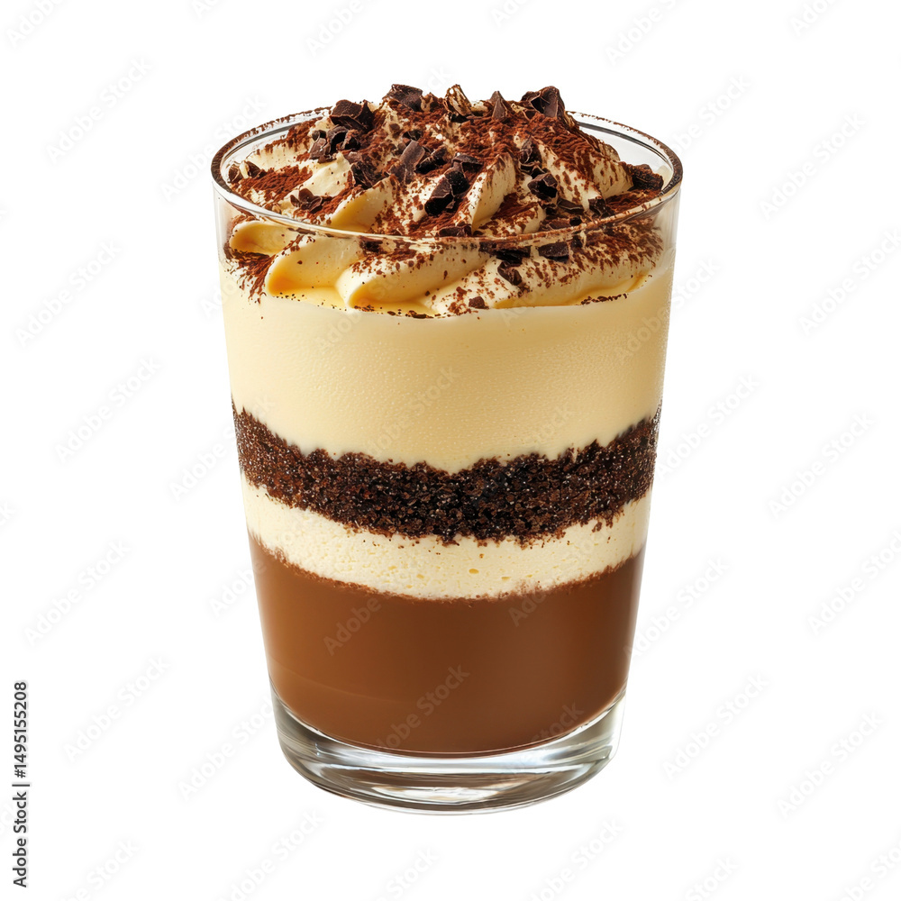 Creamy dessert layers in a glass with chocolate frosting, caramel drizzle, and whipped topping, perfect for indulgent treats or coffee shop menus