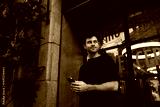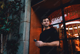 Stylish young man with mobile phone in hand smiling subtly, standing near cozy restaurant entrance with warm lights and greenery, casual evening moment in urban setting.Young male using smartphone app
