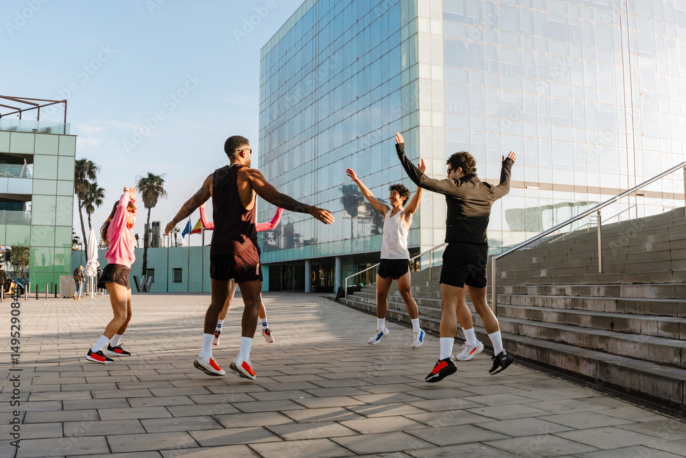 Group of six athlete friends jumping in a circle with raised arms, outdoors