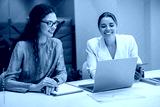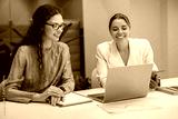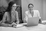 Two women in a productive meeting, confidently sharing innovative ideas and using advanced technology