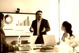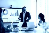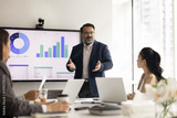 Business executive leading presentation for partners, standing in front of digital display screen showing analytics charts, engaged in investment strategy discussion, financial planning and analysis