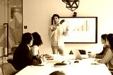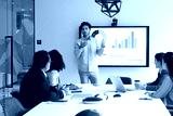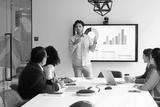 Young male professional stands in front of digital display screen presenting business data in bar and pie charts to group of colleagues seated around conference table. Strategy development, analytics