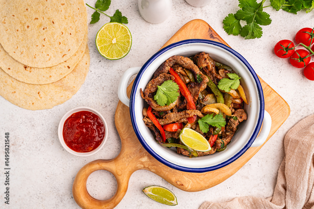 Fajitas, beef meat slices with colored pepper and onions, traditional mexican food, served with tortillas, salsa and sour cream on white background, top view. High quality photo
