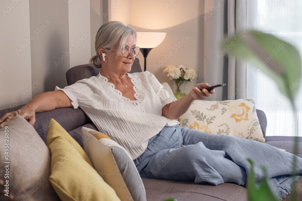 Attractive senior white haired woman sitting on home sofa holding a tv remote control. Elderly relaxed lady watching movie or social in tv wearing earphones