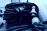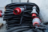 Industrial high voltage electricity cables in big pile with red high voltage industrial power outlets, dark cables piles