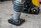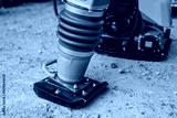 Industrial vibratory rammer on bright gravel working on road paving construction project,