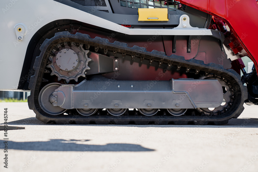 Compact skid steer loader track system side view with rubber tracks and ready to be given out to a clients
