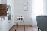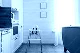 the high chair for baby food is white. cozy kitchen in a white wooden country house.