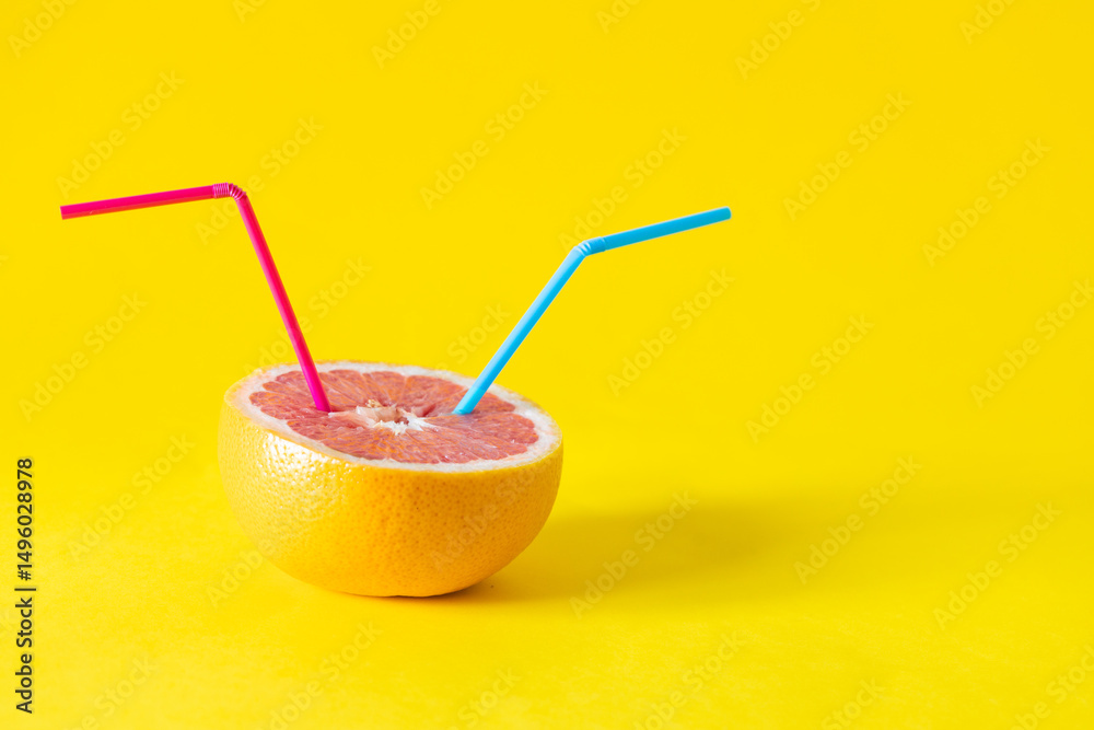 fresh fruit juices. Healthy eating concept. Vitamin-packed grapefruit with drinking straws stuck in it. Yellow background, copy space