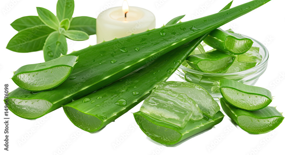 Refreshing image of fresh aloe vera leaves and gel, arranged in a serene spa setting with a soothing green theme. Ideal for wellness and beauty.