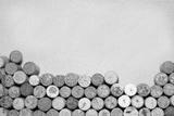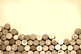 Wine corks on paper background for your text. Wall of many different wine corks with space for text. Closeup of wine corks with blurred background. Close up of cork wine on brown paper background.