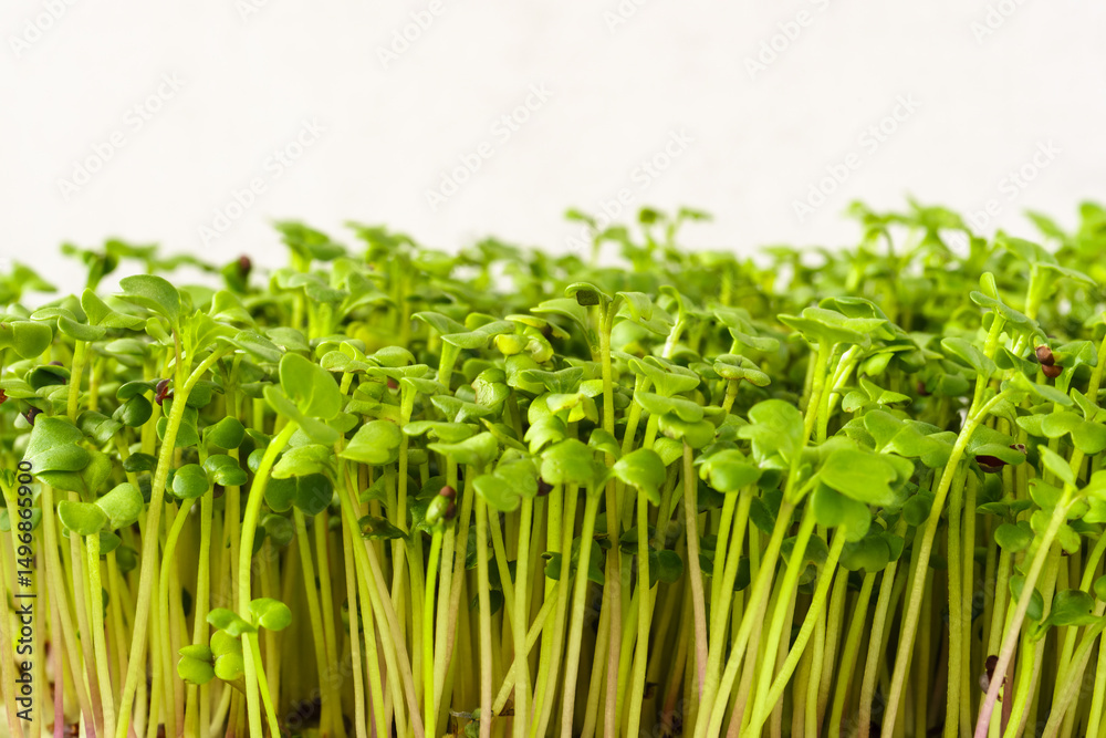 Close up of fresh green broccoli microgreen plant with many bright sprout. Healthy eating and growing sprouted seed concept agriculture.