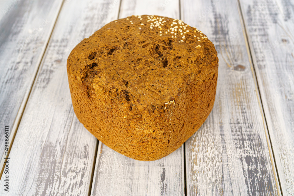 Whole grain bread loaf with sesame seeds and flax seeds on a rustic wooden table, healthy fresh baked snack food, homemade natural delicious bakery product concept.