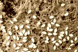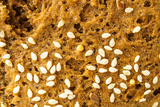 Close detailed macro view of wholesome whole grain bread texture showing the porous crust of rye country homemade bread, a baking sweet abstract background.