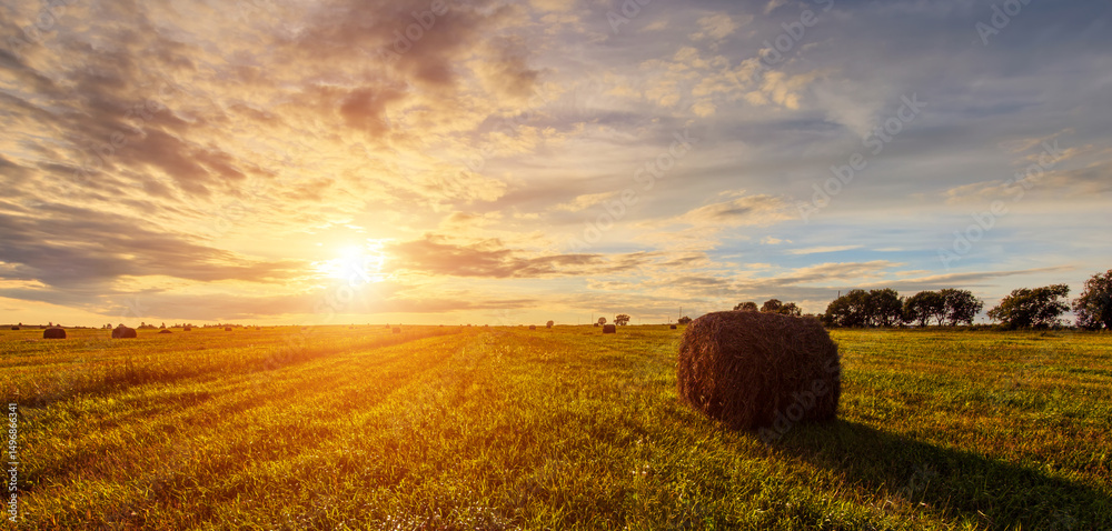 Scenic sunset over hay bales in a field. Golden light bathes the landscape, creating a tranquil scene. For agriculture, travel and inspiring greeting card designs.