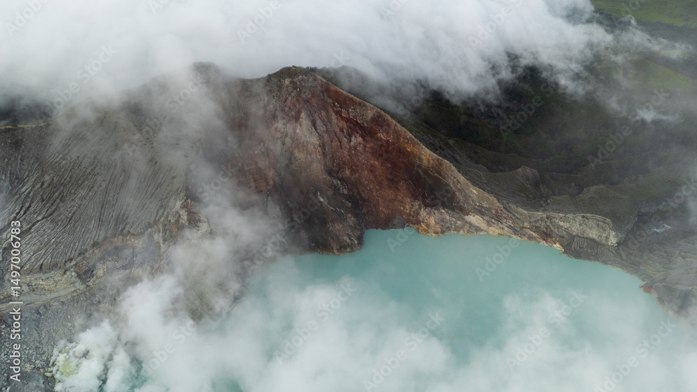 aerial view of the interior of a volcano crater, with a lake of sulphur. Java, Indonesia - 19th March 2025