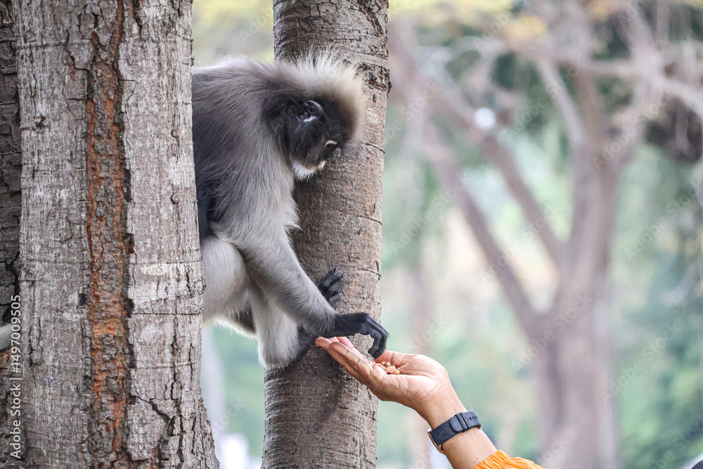 A heartwarming encounter - dusky leaf monkey takes a treat from a gentle hand