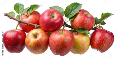 Group of Fresh Red Apples Still Attached to a Branch with Leaves