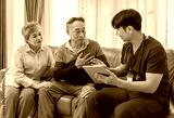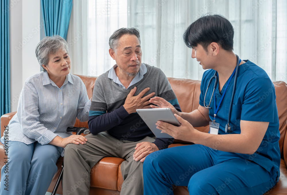 scene of senior patient talking to a visiting nurse who using tablet computer giving advice elderly man and family for self health care at home