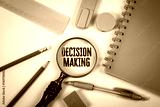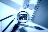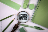 Decision Making Concept with Magnifying Glass and Green Office Supplies on White Background