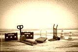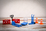 Miniature Warehouse Equipment and Safety Cones Displayed on Wooden Surface Against Neutral Wall