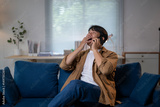 A man is sitting on a blue couch and talking on his cell phone
