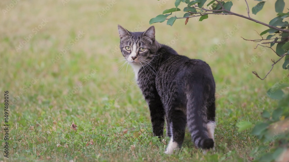 Tabby Cat standing in green grass, portrait, looking back
