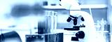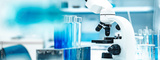 Test tubes with blue liquid in a stainless rack beside a white microscope in a clean laboratory, representing scientific research, analysis, and modern biotechnology processes.