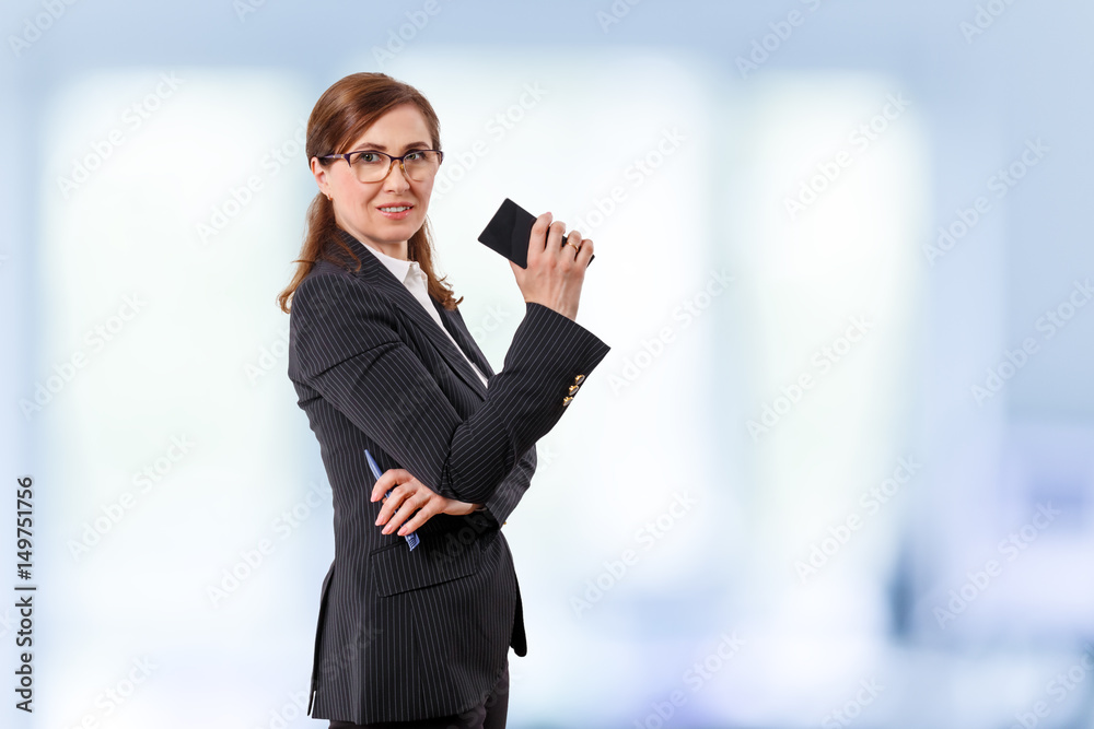 Portrait of a beautiful businesswoman 50 ears old with mobile phone in the office.